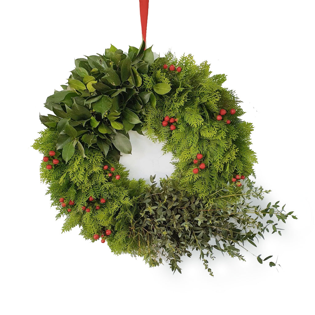 Fresh Christmas wreath filled with , berries, balete, cypress leaves and eucalyptus leaves. Last up to 2 weeks depending on heat, naturally dries out retaining most color.