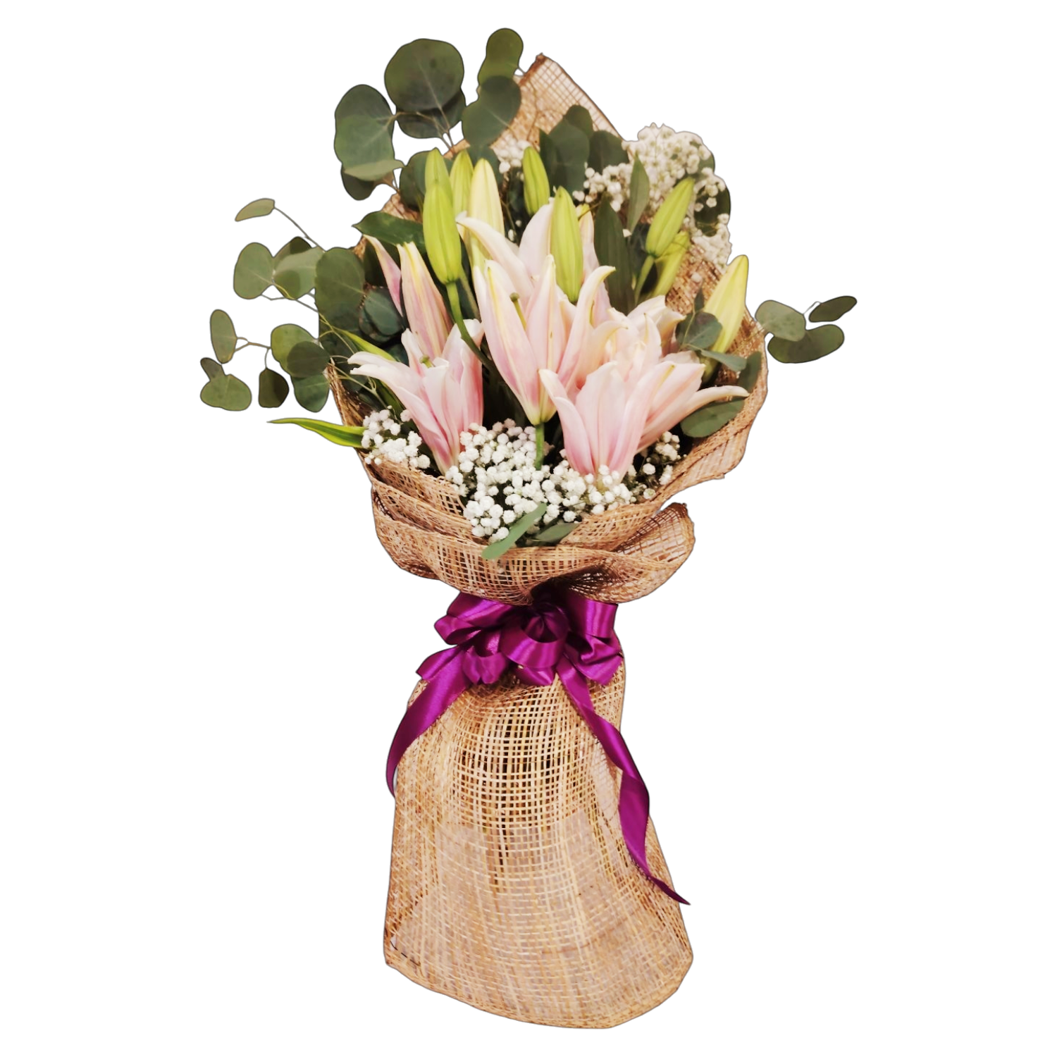 Discover the breathtaking beauty of our pageant-style bouquet, featuring 3 vibrant stems of Stargazer lilies, complemented by fresh eucalyptus and other seasonal foliage. This arrangement is perfect for adding a touch of elegance and enchantment to any occasion.