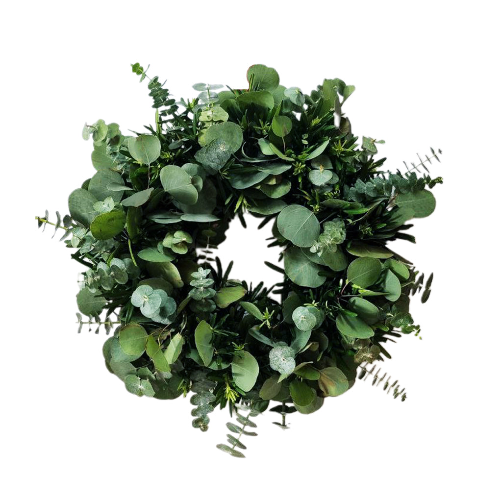Fresh Christmas wreath filled with a variety of eucalyptus and plum pine leaves. Last up to 2 weeks depending on heat, naturally dries out retaining most color.