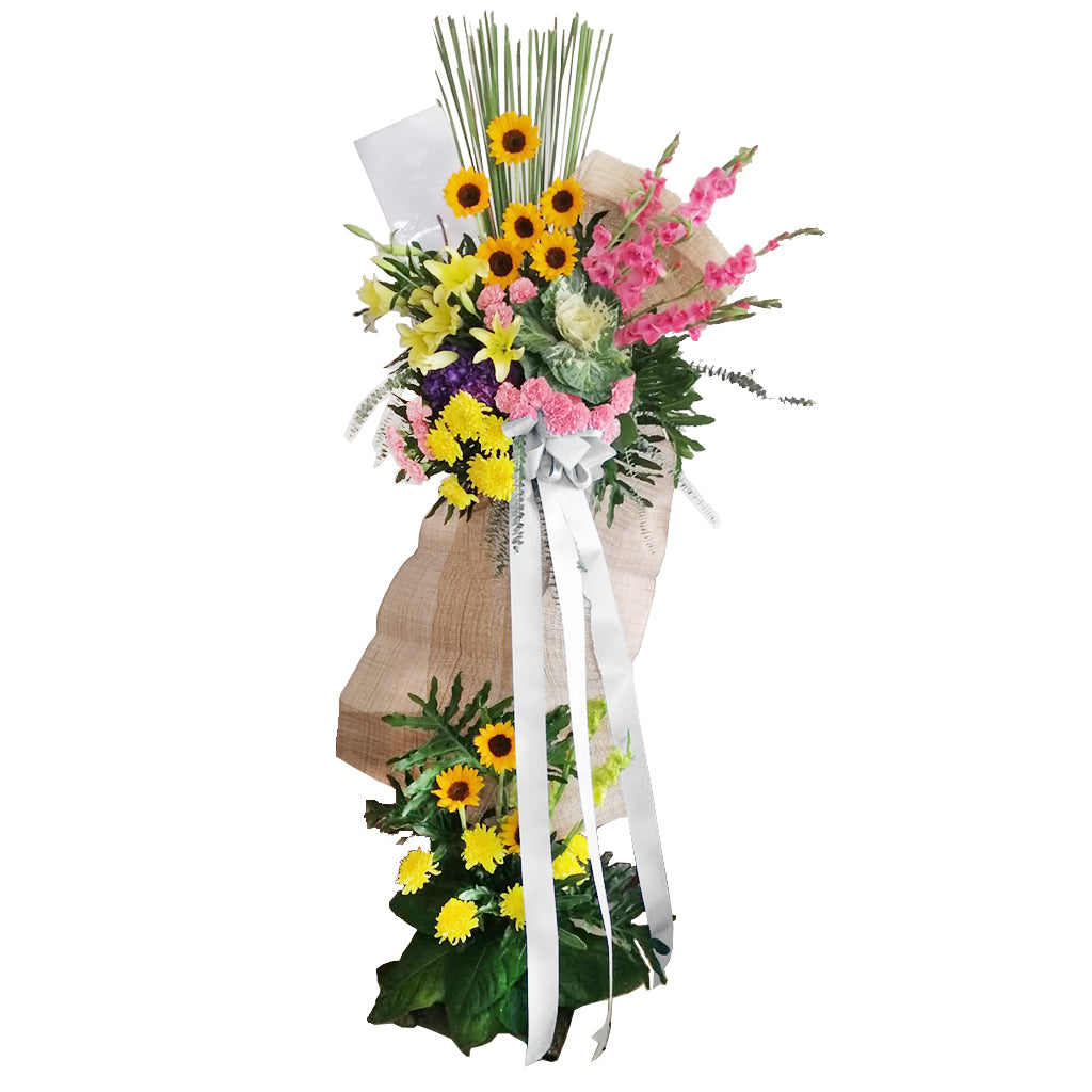 2 layers of festive yellow lilies, mums and sunflowers with pink carnations and gladiola flowers sure to brighten any celebration . This arrangement uses Driftwood base.