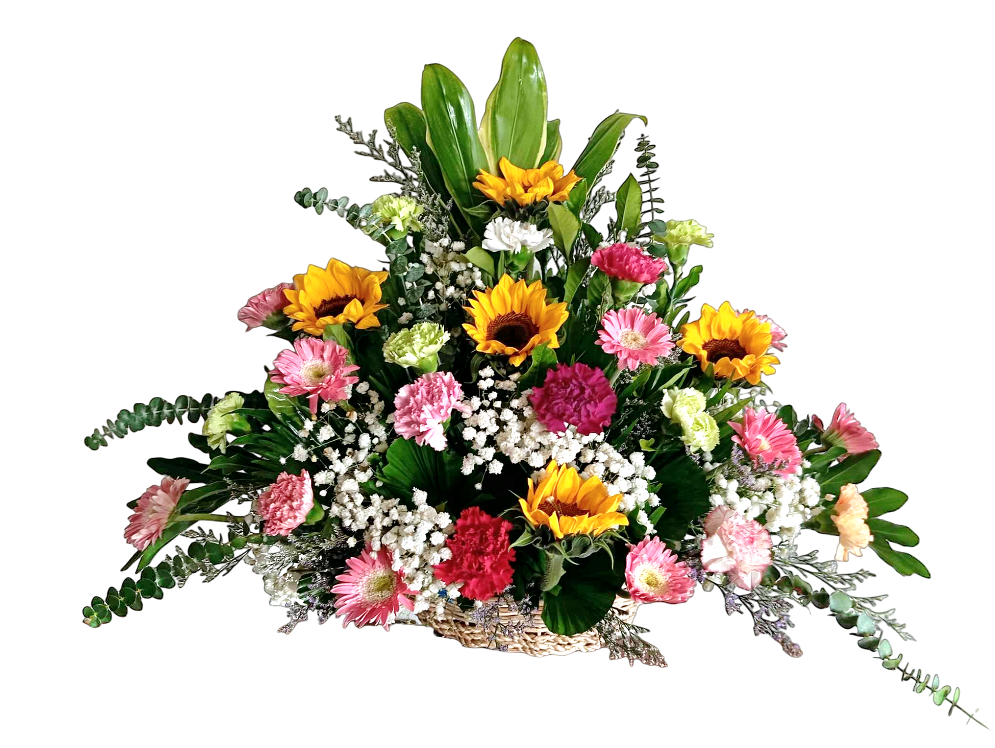 An mix of sunflowers, Gerberras, carnations arrangement with seasonal foliage