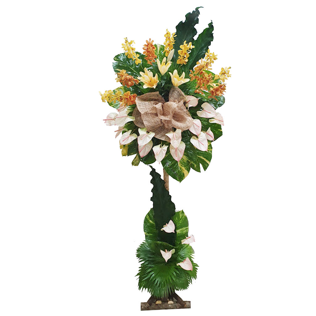 A luxurious arrangement of choice Mokara orchids, yellow lilies, and anthuriums on driftwood stand giving hope to loved ones.