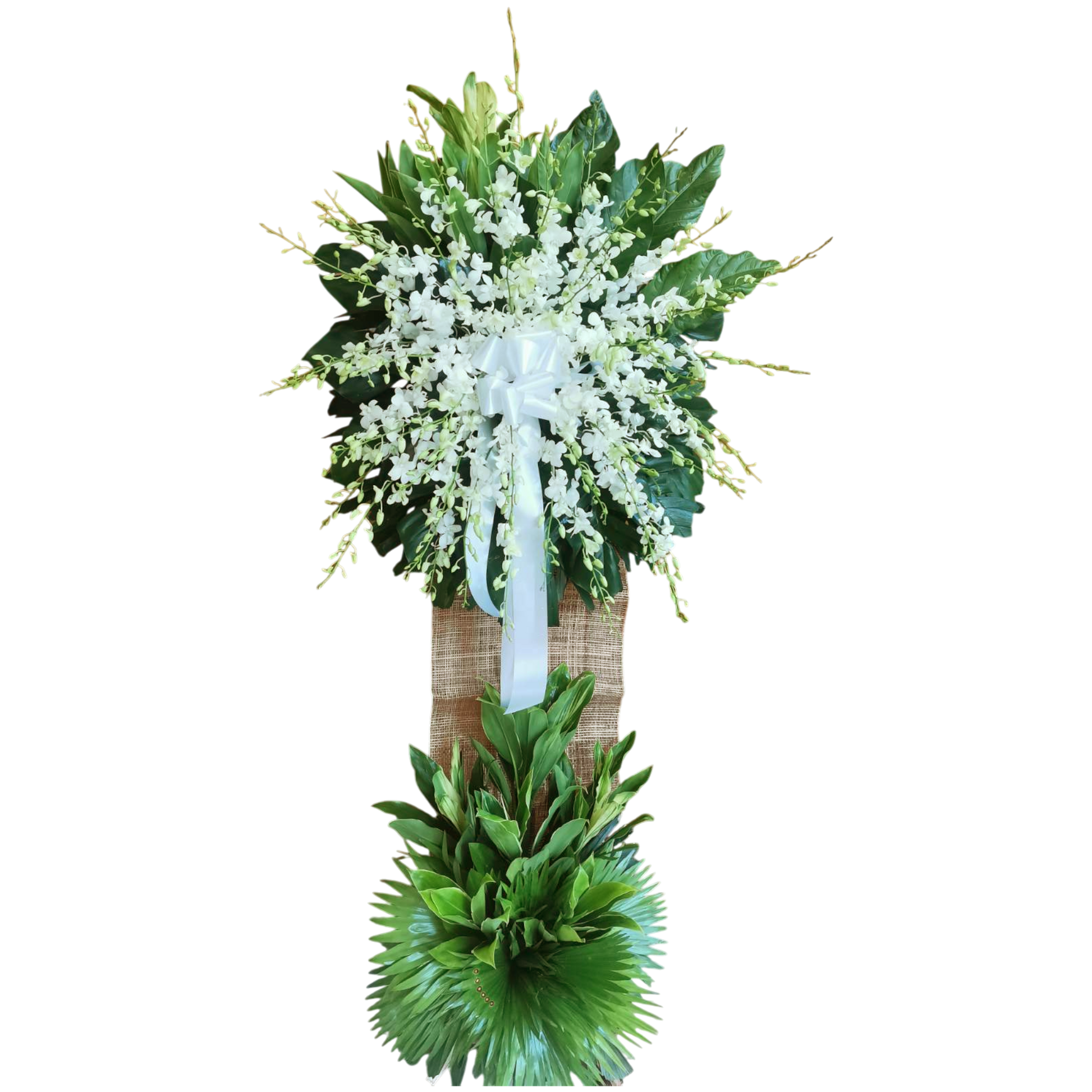 Honor a loved one with our elegant all-white orchid standing spray on driftwood base. This single-layer arrangement symbolizes purity and remembrance, offering a heartfelt tribute during times of sorrow.