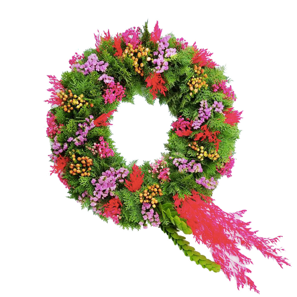 Fresh Christmas wreath filled with pink statis, berries, cypress leaves and eucalyptus leaves. Last up to 2 weeks depending on heat, naturally dries out retaining most color.